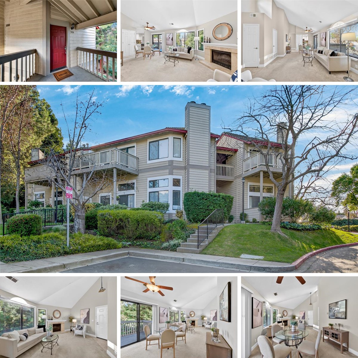 Welcome to this stunning executive two bedroom, two full bath condo in Pleasanton, where vaulted ceilings and beautiful views create a bright and inviting atmosphere from the moment you walk in. The spacious living room features a striking stone fireplace with a wood mantel and flows effortlessly into the dining area, complete with an overhead fan and sliding glass door that opens to a large balcony. From here, you can enjoy peaceful views of the HOA pool, mature trees, and Tawny Park.